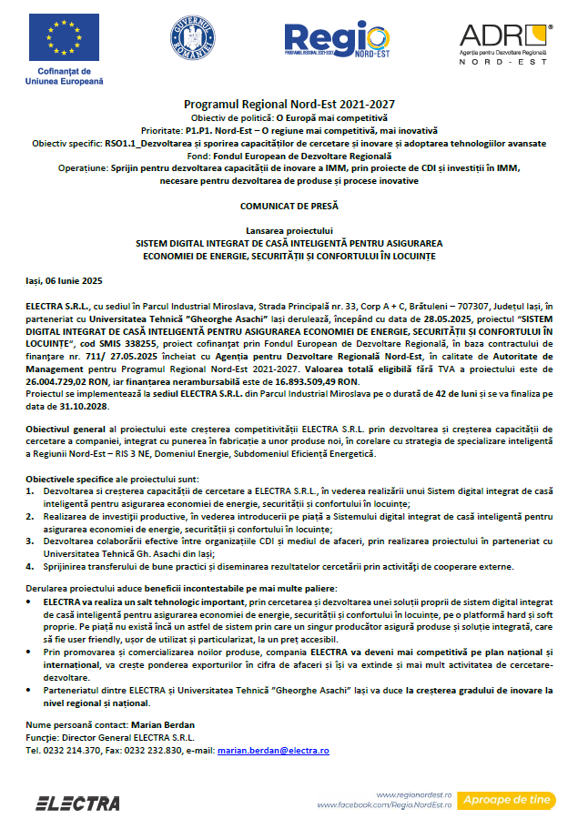 ELECTRA S.R.L., cu sediul în Parcul Industrial Miroslava, Strada Principală nr. 33, Corp A + C, Brătuleni – 707307, Județul Iași, în parteneriat cu Universitatea Tehnică ”Gheorghe Asachi” Iași derulează, începând cu data de 28.05.2025, proiectul “SISTEM DIGITAL INTEGRAT DE CASĂ INTELIGENTĂ PENTRU ASIGURAREA ECONOMIEI DE ENERGIE, SECURITĂȚII ȘI CONFORTULUI ÎN LOCUINȚE“, cod SMIS 338255, proiect cofinanţat prin Fondul European de Dezvoltare Regională, în baza contractului de finanţare nr. 711/ 27.05.2025 încheiat cu Agenția pentru Dezvoltare Regională Nord-Est, în calitate de Autoritate de Management pentru Programul Regional Nord-Est 2021-2027.
