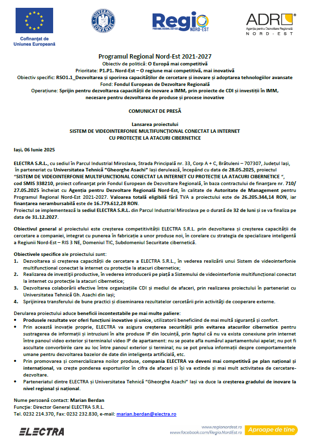 ELECTRA S.R.L., cu sediul în Parcul Industrial Miroslava, Strada Principală nr. 33, Corp A + C, Brătuleni – 707307, Județul Iași, în parteneriat cu Universitatea Tehnică ”Gheorghe Asachi” Iași derulează, începând cu data de 28.05.2025, proiectul “SISTEM DE VIDEOINTERFONIE MULTIFUNCȚIONAL CONECTAT LA INTERNET CU PROTECȚIE LA ATACURI CIBERNETICE“, cod SMIS 338210, proiect cofinanţat prin Fondul European de Dezvoltare Regională, în baza contractului de finanţare nr. 710/27.05.2025 încheiat cu Agenția pentru Dezvoltare Regională Nord-Est, în calitate de Autoritate de Management pentru Programul Regional Nord-Est 2021-2027.