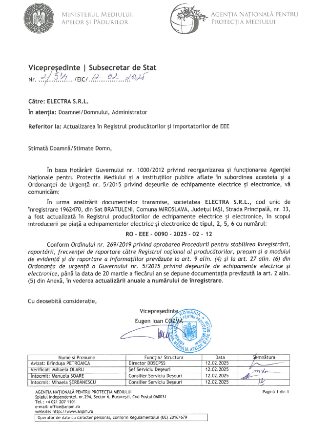 Din anul 2005, ELECTRA deține certificarea de mediu în conformitate cu EN ISO 14001, care garantează utilizarea rațională a resurselor și minimizarea impactului imediat și pe termen lung asupra mediului, inclusiv conformitatea cu standardele și reglementările legale. De asemenea, pentru realizarea produselor noastre utilizăm materiale și tehnologii care respectă Directiva RoHS.